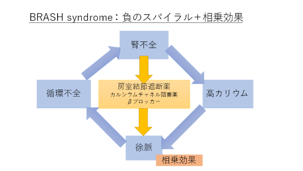 なんだかかっこいい名前がついていますが、Bradycardia, Renal failure, AV nodal blockade, Shock, Hyperkalemiaの頭文字をくっつけた症候群名になります。高K血症による徐脈と腎不全・アシドーシスによる房室伝導の障害が組み合わさり、著しい徐脈をきたします。またさらに、それによる循環不全が腎不全を増悪させるという負のスパイラルが起きているのがBRASH症候群の病態となっています。心不全に対するβブロッカーによる房室伝導抑制やMRAによる高K血症もこの病態をさらに悪化させることがあります。本症例では、これらの薬剤の内服はありませんでしたが、ひょっとすると3ヶ月くらい前に認めていた動悸は完全房室ブロックで、それにより急激にこの病態が加速していったのかもしれません。