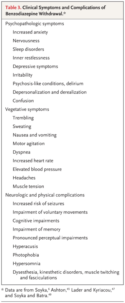 ベンゾジアゼピン系薬剤の使用中止後2~3日以内に始まり、10~14日間、あるいはそれ以上持続します。