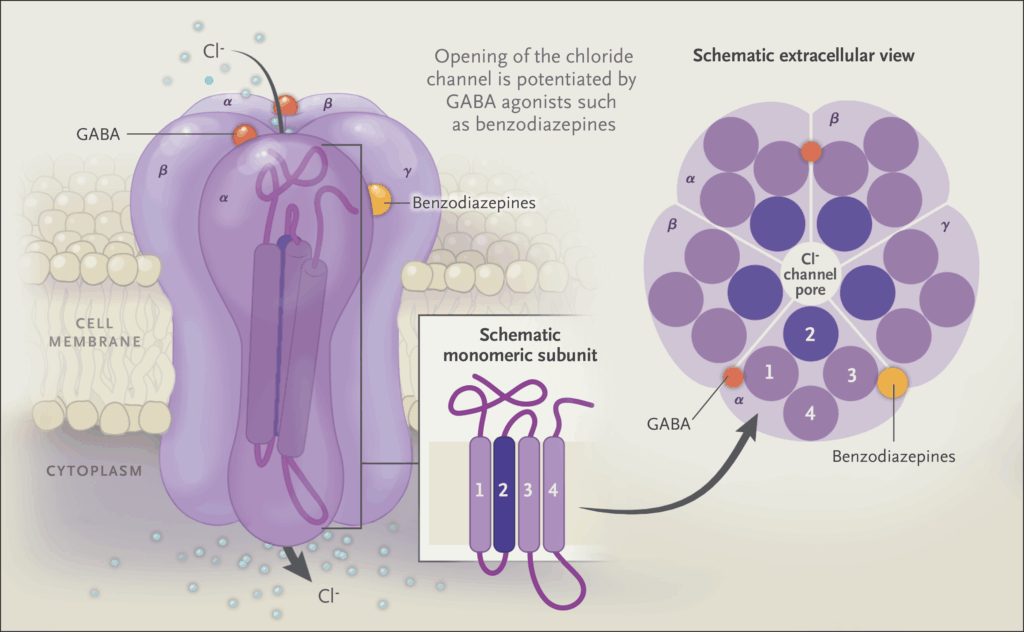 ベンゾジアゼピン系薬物はγ-アミノ酪酸(GABA)A型(GABA A)受容体の特定の部位に結合し、抑制性神経伝達物質の親和性を亢進させます。慢性使用は、γ-アミノ酪酸(GABA)A受容体を介したシグナル伝達を低下させるため、中止することで抑制性シグナルが減少して興奮性の臨床症状を引き起こすと言われています。
