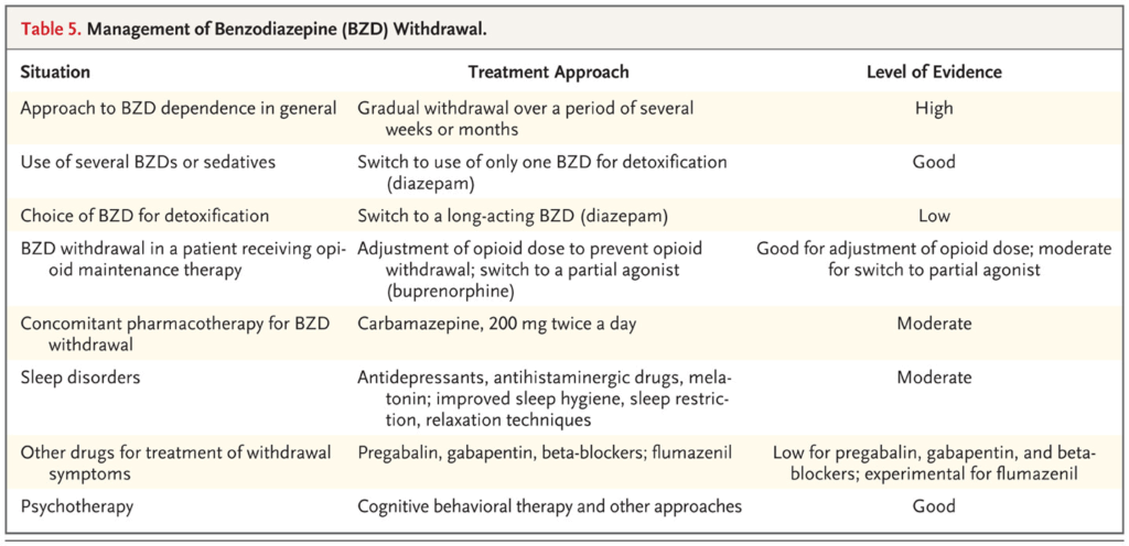 ジアゼパム用量が1日30mgを超える場合は4~6週間以上かけて徐々に中止すべきとされています。外来での漸減も可能とされてはいますが、非常に高用量(1 日あたりジアゼパム 100 mg 以上に相当する用量)からの離脱には入院が必要です。背景の疾患によってはうつ病や不安症など精神疾患が悪化しないように精神科との相談が必須です。ここらへんの漸減方法についてはJ hospitalistで丁寧にまとめてくださっていたので下のリンクでご紹介させていただきます。