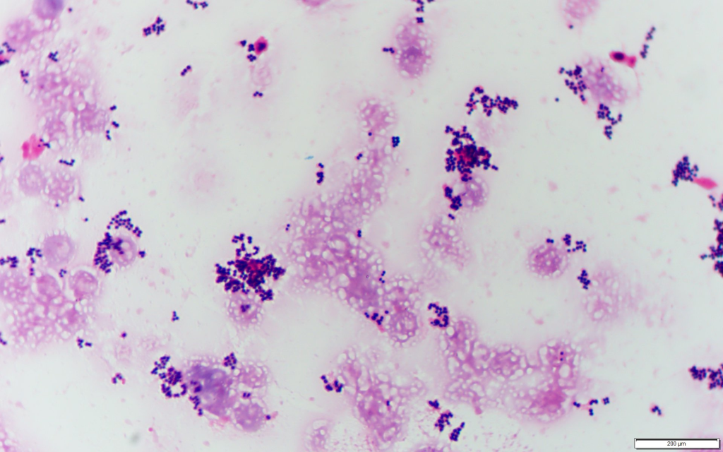 Staphylococcus aureusはブドウの房状の形態を示すグラム陽性球菌です(Gram Positive Cluster:GPC)です。Gram染色ではコアグラーぜ非産生菌の表皮ブドウ球菌(CNS)と異なり、菌体の周囲に濃いピンク色のフィブリン塊を認めることがあります。(感度78%,特異度95% Hadano Y, et al:BMC Infect Dis. 2018;18(1):490.)