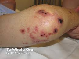 黄色ブドウ球菌が血液培養で検出された時には感染性心内膜炎(IE)を考える必要があります。黄色ブドウ球菌の播種性は凄まじく、さまざまなとこに播種性病変を認めます(とにかく凄まじいという印象を持ってください)。眼瞼結膜の点状出血、Osler結節,Janeway発疹、Roth斑(眼底の出血性梗塞) はもちろん、下の写真のように指趾末端ではなく膝にできたり、筋肉内などあらゆる場所に微小膿瘍を形成します。(以前紹介した壊疽性膿瘡よりも小さな病変が多いです。)