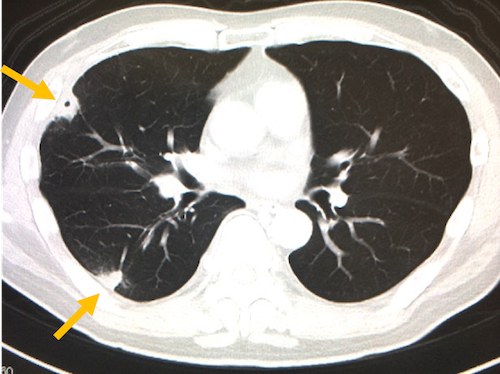 また左心系のIEではこのように全身の病変をきたしますが、右心系のIEでは肺野の胸膜直下付近にseptic emboliを形成し、空洞性病変を形成したりします。