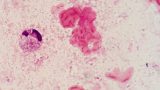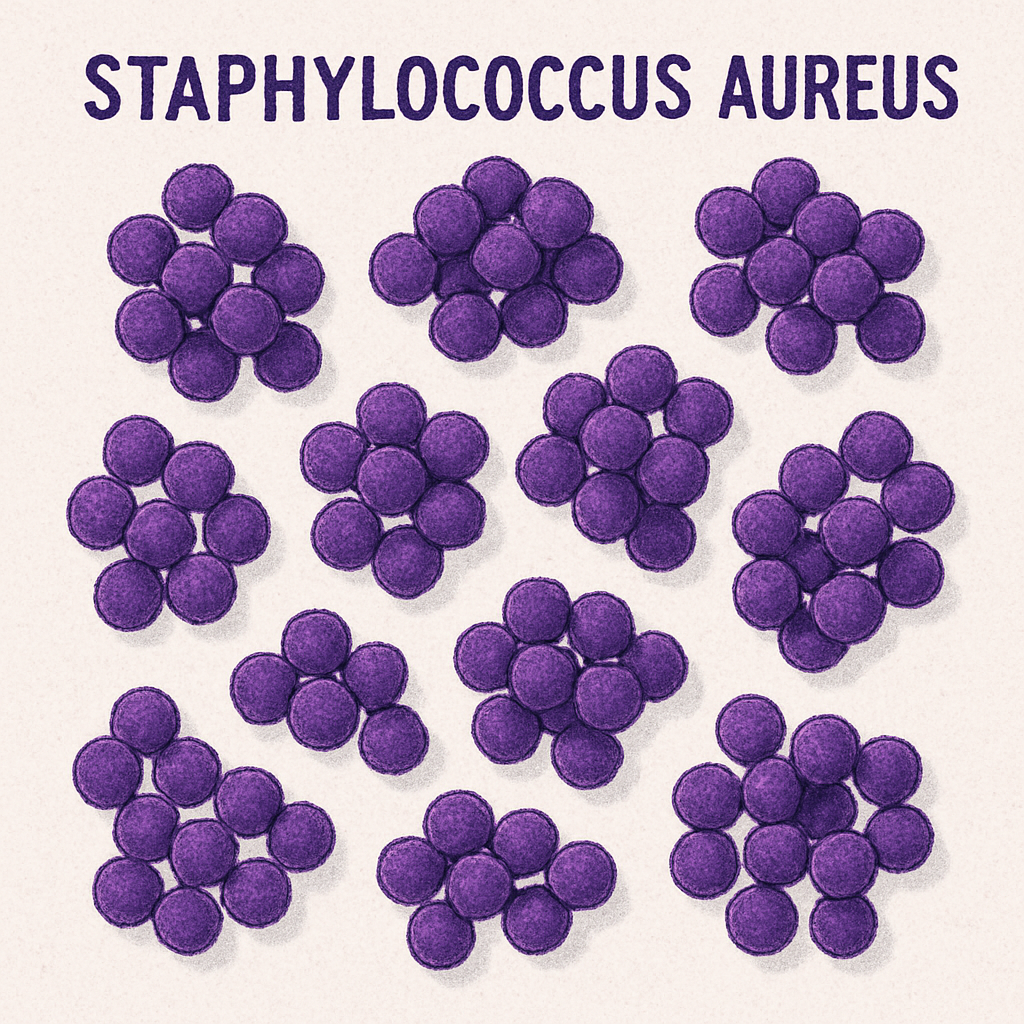 Staphylococcus aureusはブドウの房状の形態を示すグラム陽性球菌です(Gram Positive Cluster:GPC)です。Gram染色ではコアグラーぜ非産生菌の表皮ブドウ球菌(CNS)と異なり、菌体の周囲に濃いピンク色のフィブリン塊を認めることがあります。(感度78%,特異度95% Hadano Y, et al:BMC Infect Dis. 2018;18(1):490.)